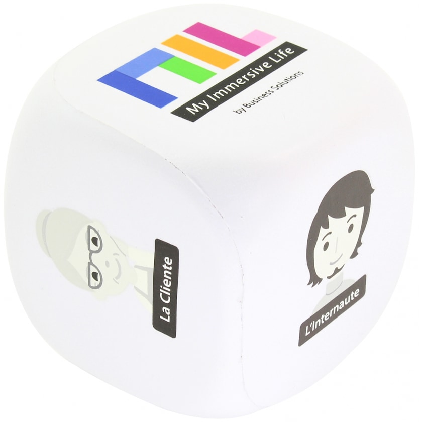 Stressball in Form eines Würfels ohne Punkte. Perfekt für alle, die mehrere Seiten bedrucken möchten.