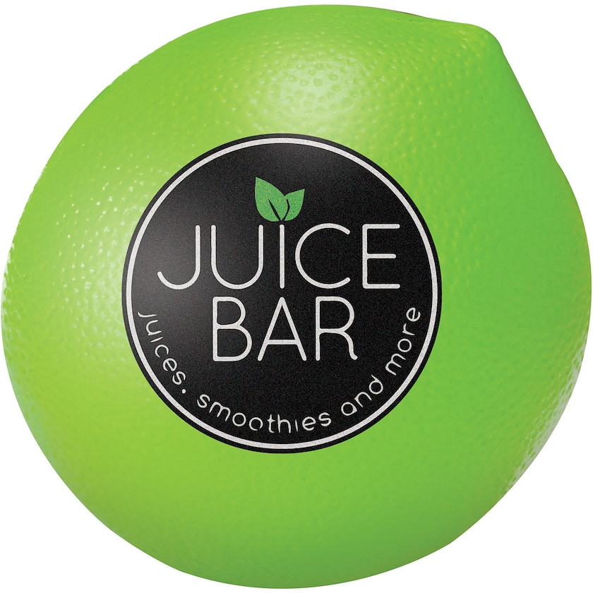 Stressball mit Druck in Form einer Limette. Der Aufdruck ist hochwertig und hält auch längerem Kneten stand.