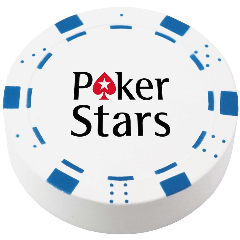 Anti-Stressball im Pokerchip-Design. Der blaue Rand ist bei allen Stressbällen. Ein cooles Werbeprodukt für Unternehmen in der Glücksspielbranche.