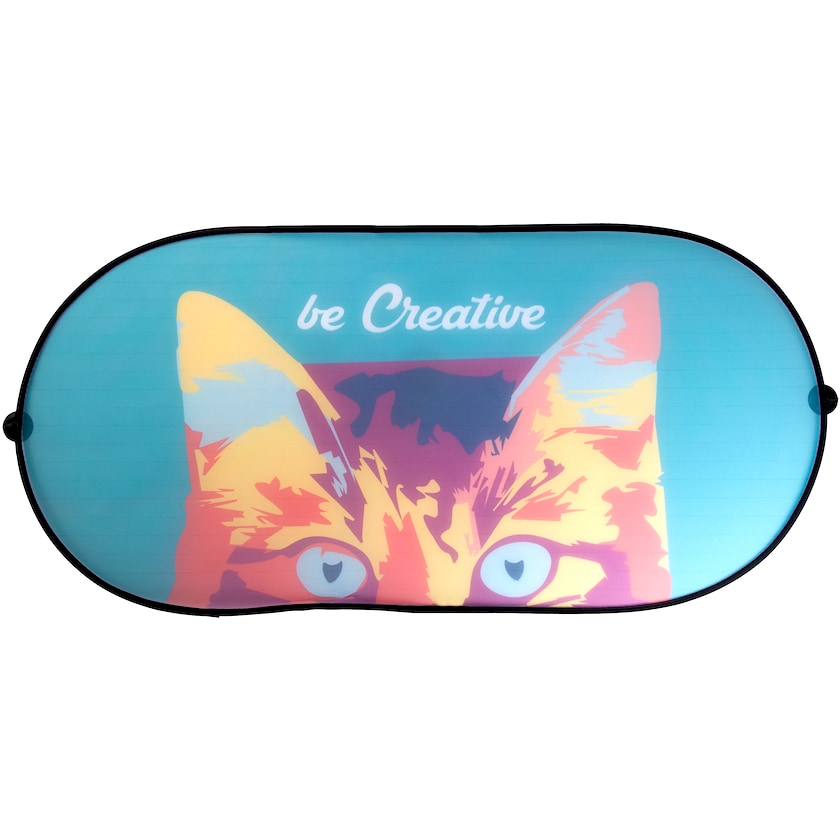 Sonnenschutz mit 4-Farbdrucl für die Heckscheibe. Der Sonnenschutz kann, wenn er nicht verwendet wird, zusammengefaltet werden. Der Sonnenschutz wird mit Saugnäpfen geliefert. Der gesamte Sonnenschutz wird mit 4-Farb-Fotodruck bedruckt.