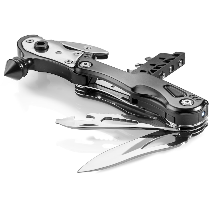 Nothammer mit insgesamt 11 verschiedenen Funktionen. Neben der Funktion als Nothammer für die Scheiben ist dieser Nothammer auch Gurtmesser, Taschenlampe, Messer, 3-fach Schraubendreher, Schere, Flaschenöffner usw. Geliefert wird in einem schwarzen Etui. Das Logo wird mit Lasergravur aufgebracht.