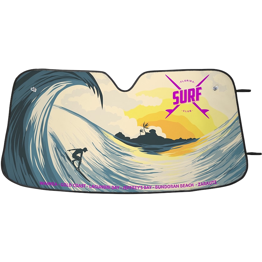 Sonnenschutz für die Windschutzscheibe des Autos mit vollflächigem Druck. Sonnenschutz Lockhart besteht aus Polyester mit einer PU-Rückseite und zwei Lagen Aluminium-Luftpolsterfolie. Die Sonnenblende wird mit zwei Saugnäpfen befestigt. Da der Sonnenschutz nach der Bestellung im Werk hergestellt wird, ist die Lieferzeit länger als normal.