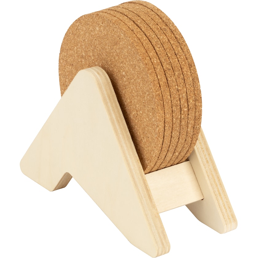 Set mit 6 Korkuntersetzern. Das Set wird mit einem Sperrholzhalter geliefert. Da das Produkt aus natürlichen Materialien besteht, können Farbe und Druckergebnis zwischen den Produkten leicht variieren.