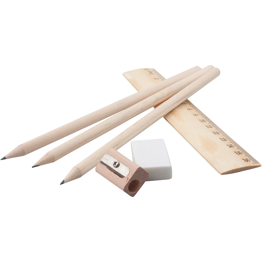 Hübsches Set mit 3 Bleistiften, Anspitzer, Lineal und Radiergummi. Druck erfolgt auf dem Karton.