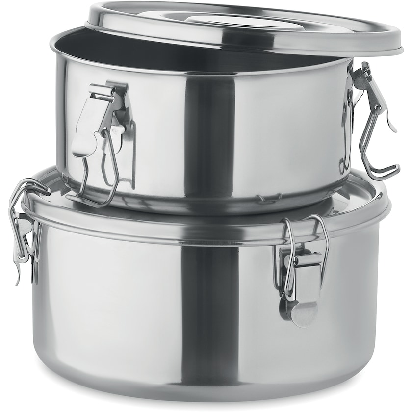Set, bestehend aus zwei Lunchboxen aus Edelstahl. Dank der kräftigen Schnallen bewahrt Lugo Ihr Essen sicher auf. Die Lunchboxen fassen 45 bzw. 90cl und können in der Spülmaschine gewaschen werden. Der Preis für die Lasergravur bezieht sich auf die Markierung auf einer der Dosen.