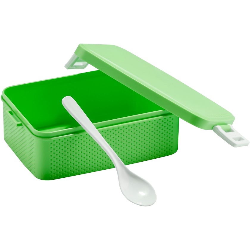 Großzügige Lunchbox mit Löffel. Die Lunchbox fasst 90 cl. Der Deckel bleibt dank der Clips am Platz. Die Lunchbox ist BPA-frei.