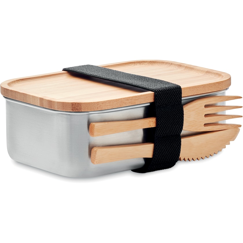 Lunchbox aus Edelstahl mit Deckel aus Bambus. Messer und Gabel aus Bambus werden mitgeliefert. Der Deckel wird durch das schwarze Polyesterband dicht gehalten.
