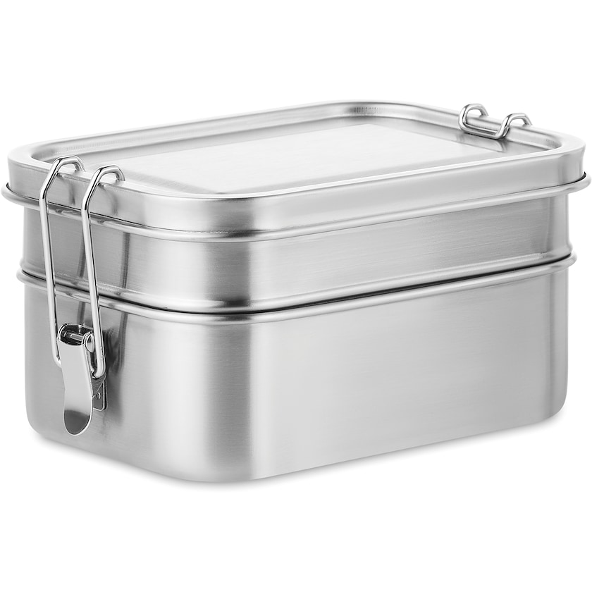 Große Lunchbox aus Edelstahl. Somerton bietet Platz für 1,2 l verteilt auf zwei Aufbewahrungsfächer. Die Bedruckung kann entweder mittels eines 4-Farb-Domings oder per Lasergravur erfolgen. Die Lunchbox ist sowohl für die Spülmaschine als auch für einen gewöhnlichen Ofen geeignet, allerdings nicht für die Mikrowellenherd.