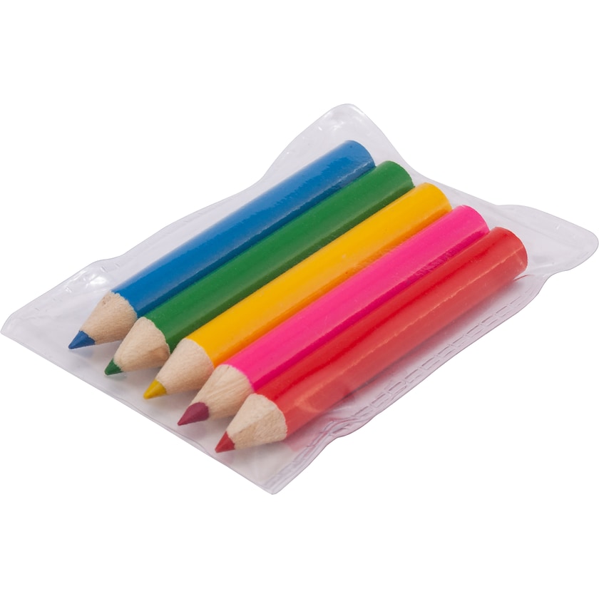 Kleines Set mit 5 Farbstiften. Die Buntstifte werden in einer transparenten Aufbewahrungsbox geliefert, die mit Digitaldruck bedruckt werden kann.
