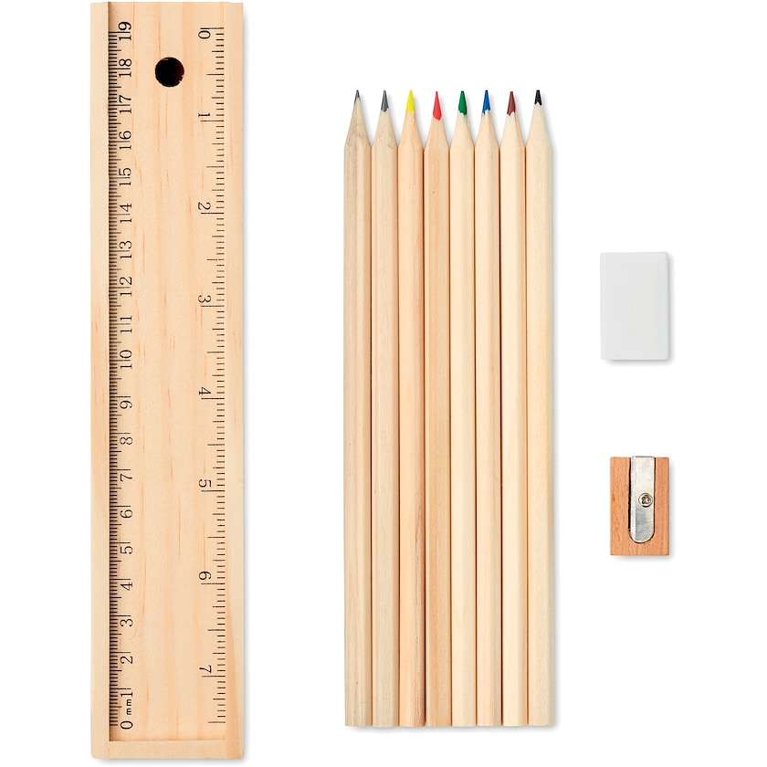 Buntstift-Set mit Aufbewahrungsschachtel aus Holz. Das Set enthält 2 Bleistifte, 6 Buntstifte, 1 Anspitzer, 1 Radiergummi und 1 Lineal. Das Lineal dient gleichzeitig als Deckel der Holzkiste.