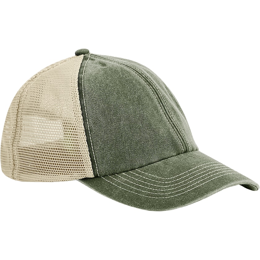 Umweltfreundliche Trucker-Cap mit Vintage-Feeling. Das Netz der Kappe besteht aus recyceltem Polyester. Die Vorderseite besteht aus einem robusten Baumwollstoff.