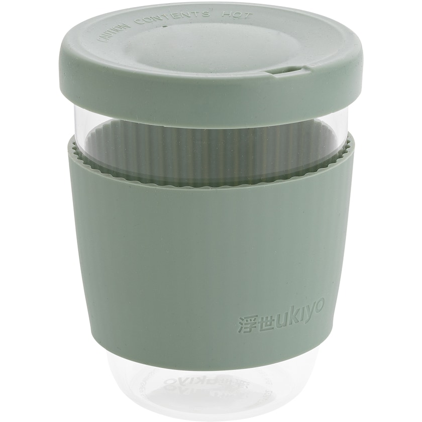 To Go-Becher aus Glas von Ukiyo. Manschette und Deckel sind aus Silikon. Der Deckel hat eine kleine Öffnung, damit Dampf entweichen kann. Das Glas ist vom Typ Borosilikat, was bedeutet, dass es feuerfest und sehr langlebig ist.