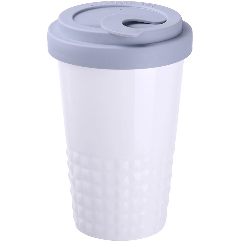 Formschöner Porzellanbecher zum Mitnehmen mit auslaufsicherem Deckel. Der Porzellanbecher hat einen einzigartig gestalteten Boden, der angenehm in der Hand liegt. Dank der Doppelwände bleibt das Getränk länger als normal warm. Der Deckel besteht aus Gummi.
