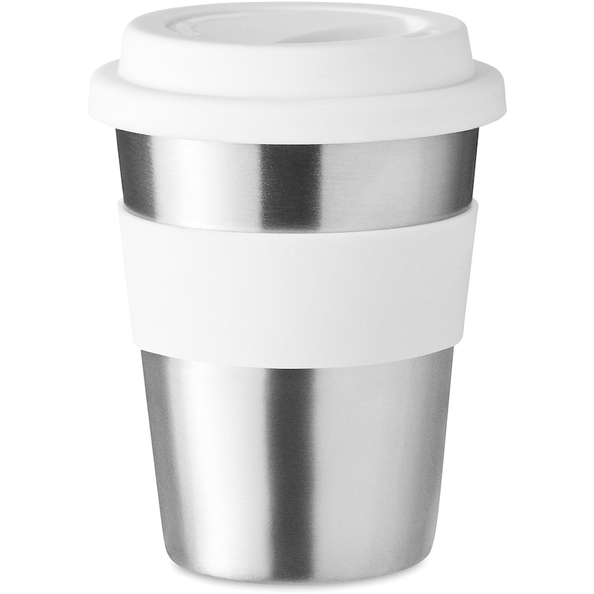 To Go Becher aus Edelstahl mit Deckel und Griff aus Silikon. Der Becher hat eine perfekte Füllmenge von 35 cl. Wenn Sie sich auf nur eine Farbe beschränken können, ist die Druckfläche ganze 220 x 20 mm, also deutlich größer als normal.