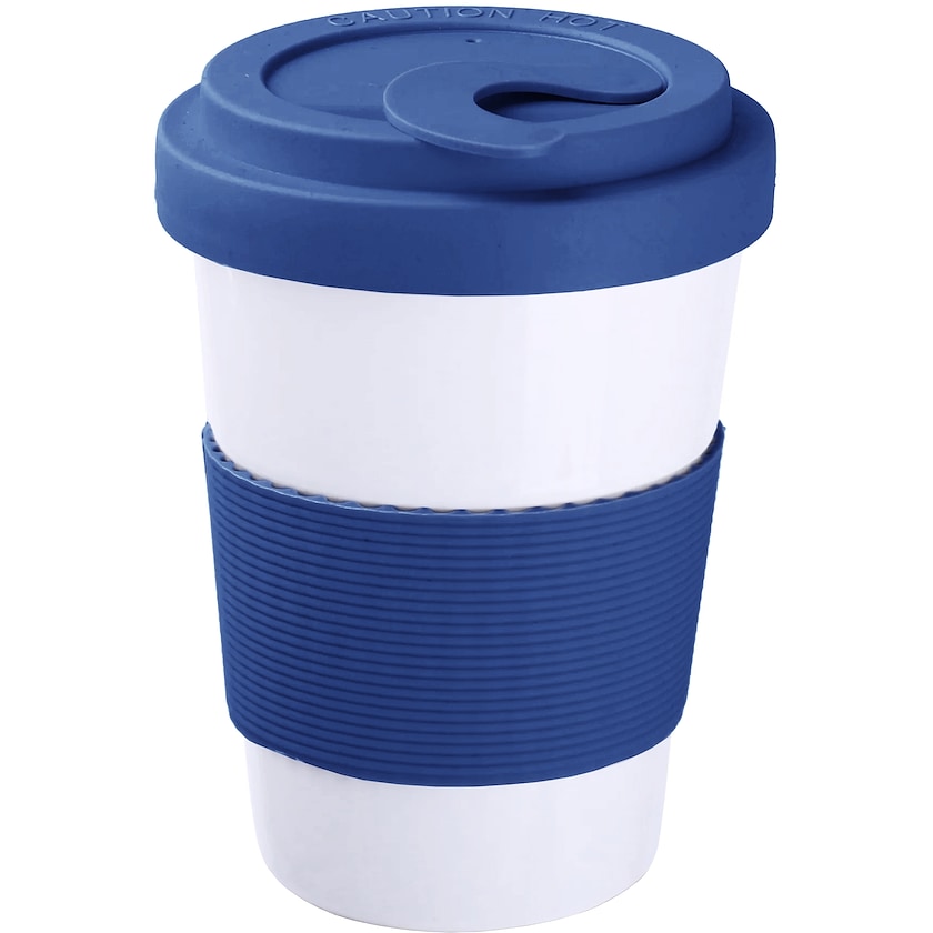 Take-Away-Becher mit Silikondeckel mit Sicherheitsverschluss. Der Becher hat einen bequemen Gummigriff und doppelte Wände. Dank des Sicherheitsverschlusses riskieren Sie nicht, heiße Getränke auf sich selbst oder andere zu verschütten.