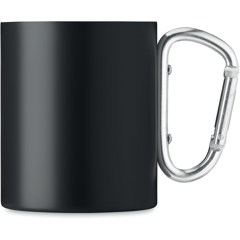 Edelstahlbecher mit Karabiner als Henkel. Der Becher ist doppelwandig, wodurch Heißgetränke länger warm gehalten werden.