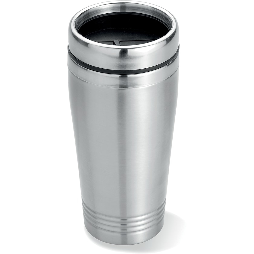 Eleganter doppelwandiger Reisebecher aus Metall. Der Becher ist aus rostfreiem Stahl und hat einen Deckel aus Polypropen. Die Markierung erfolgt entweder mit Druck oder Lasergravur.