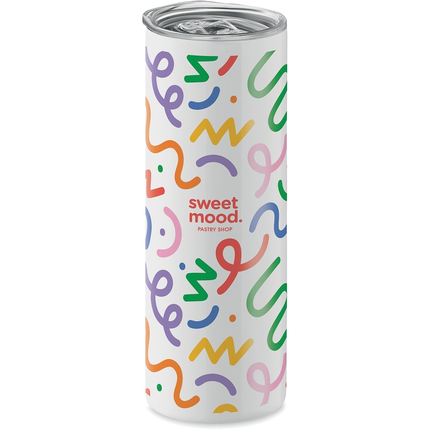 Weißer Metallbecher, dessen gesamte Oberfläche bedruckt werden kann. High Hill ist aus Edelstahl gefertigt. Dank der doppelten Wände bleibt das Getränk lange heiß bzw. kalt.
