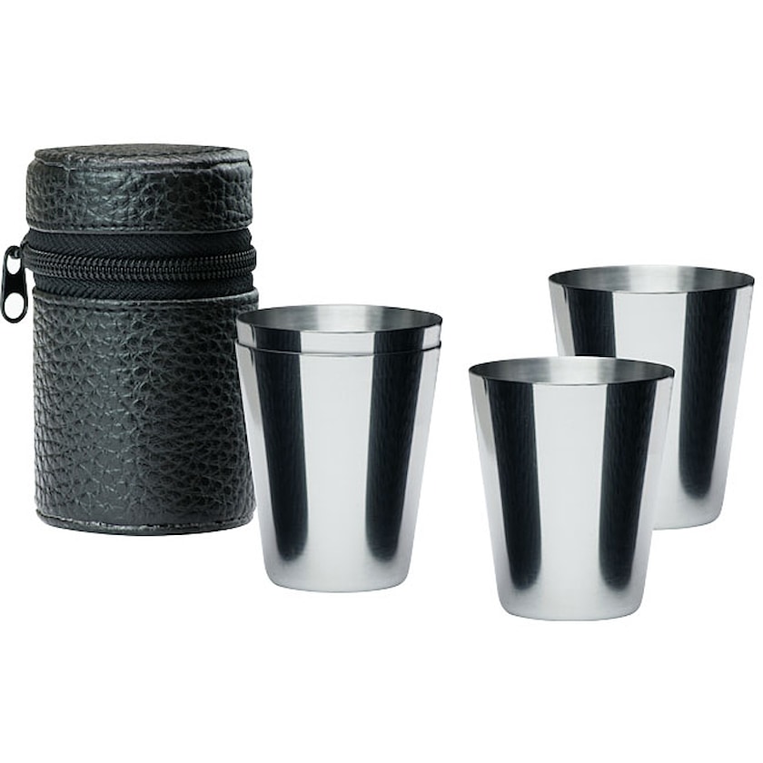 4 Metallbecher aus rostfreiem Stahl, in Kunstlederverpackung. Der Preis für die Lasergravur beinhaltet alle 4 Edelstahlbecher.