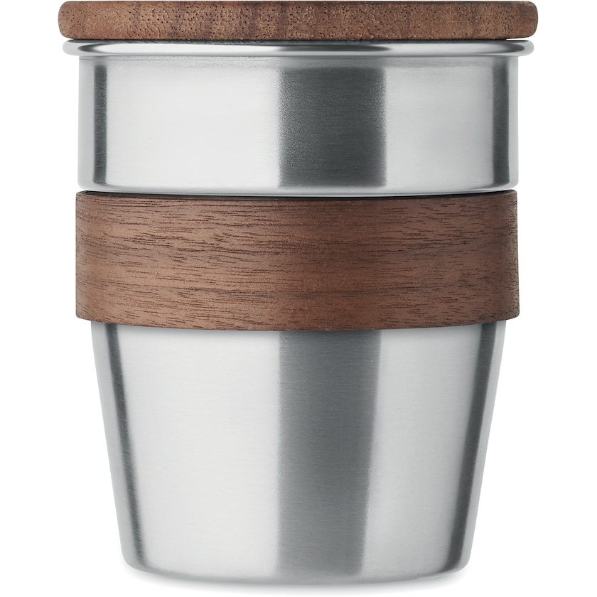Exklusiver Becher aus recyceltem Edelstahl und Walnussholz. Der Becher ist einwandig und besteht zu 90 % aus recyceltem Edelstahl und zu 10 % aus normalem Edelstahl. Beim Waschen sollte der Griff abgenommen werden. Da der Becher einwandig ist, kann es bei heißen Getränken zu einer Wärmeübertragung kommen.