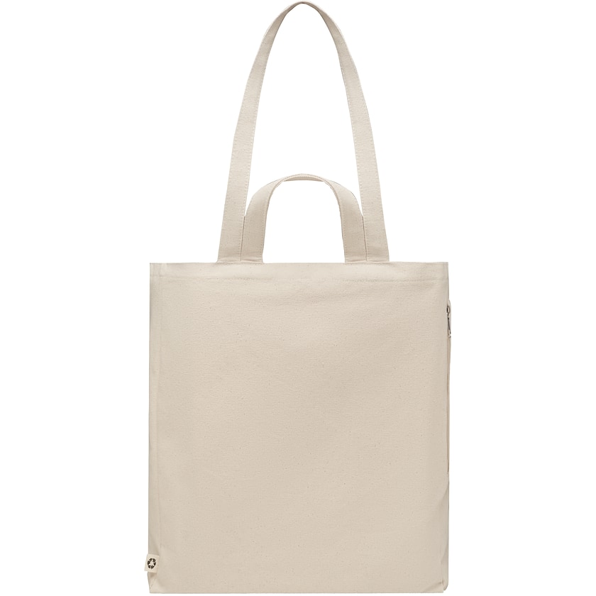 Stoffbeutel aus robuster Baumwollmischung. Brienz besteht aus 70% recycelter Baumwolle und 30% recyceltem Polyester. Die Tasche hat sowohl lange als auch kurze Henkel. Seitlich befindet sich eine Aufbewahrungstasche mit Reißverschluss.