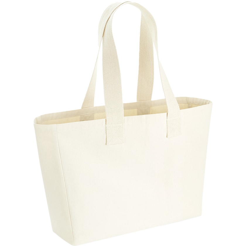 Baumwolltasche mit breiten, bequemen Baumwollhenkeln. Herrin besteht aus einem robusten 340 Gramm schweren Baumwollstoff. Kann entweder in der Hand oder über der Schulter getragen werden.
