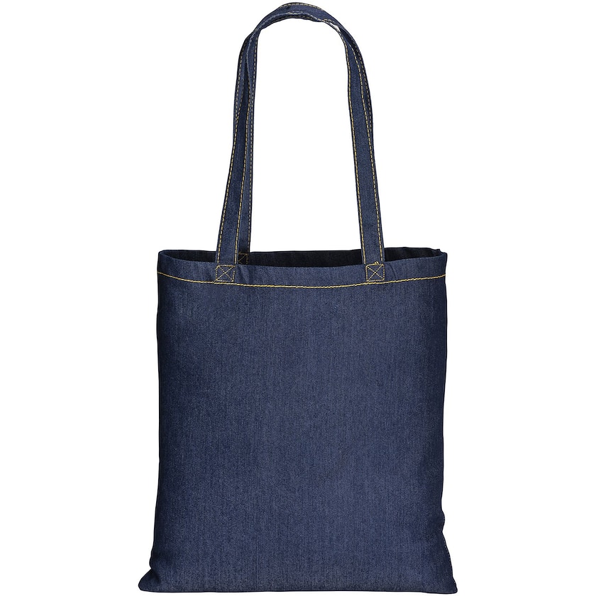 Stofftasche in Jeansstoff aus recycelter Baumwolle. Der Jeansstoff und die gelben Nähte verleihen der Stofftasche ein einzigartiges und attraktives Aussehen.