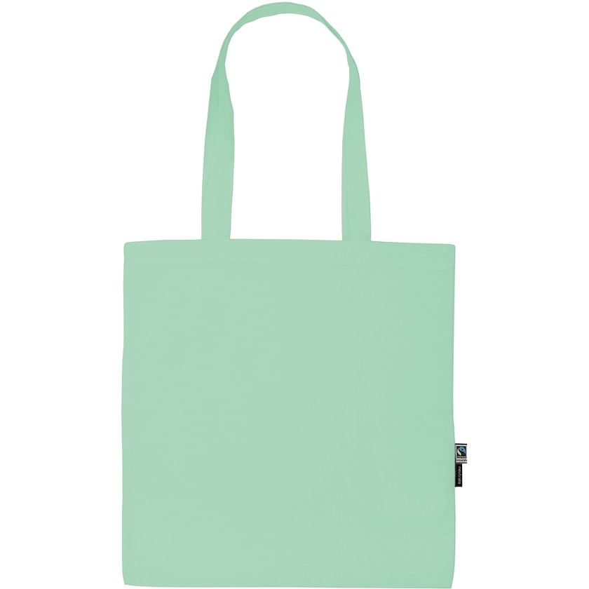 Farbige Einkaufstasche aus Fairtrade-zertifizierter Bio-Baumwolle. Mit 66 cm langem Griff. In vielen verschiedenen Farben. Faitrade, EU Ecolabel, SA8000 und OEKO-tex zertifiziert.