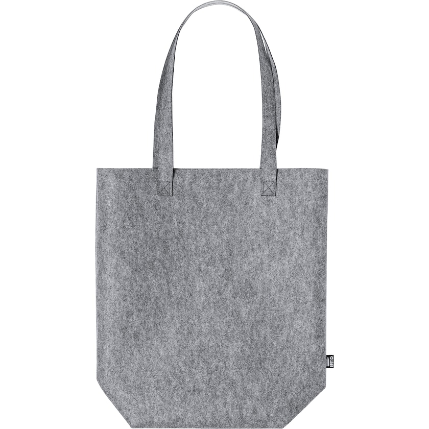 Smarte Filztasche aus umweltfreundlichem Material. Das Filzmaterial wird aus rPET (recycelten PET-Flaschen) hergestellt. Seitlich befindet sich ein Etikett, das darauf hinweist, dass es sich um rPET handelt.