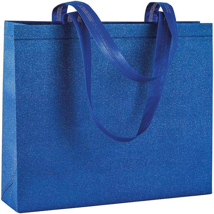 Non-woven-Einkaufstasche aus glitzerndem Stoff. Die Tasche hat einen kurzen Tragegriff und einen breiten Boden. Es gibt sie u.a. in gold und silber. Glitter ist die perfekte Wahl, wenn Sie einen goldfarbenen Stoffbeutel mit Logo suchen!