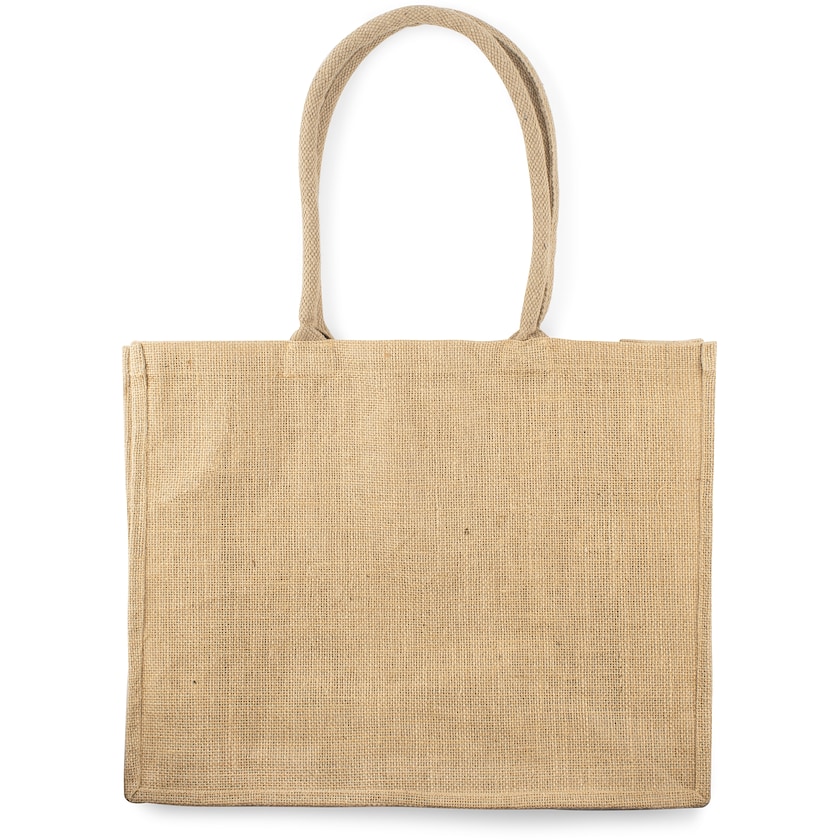 Elegante Jutetasche von hoher Qualität. Die Innenseite ist für erhöhte Haltbarkeit laminiert, dies erleichtert auch die Reinigung der Tasche. Die Henkel sind ca. 65 cm lang, wodurch sich die Tasche auch gut über der Schulter tragen lässt.