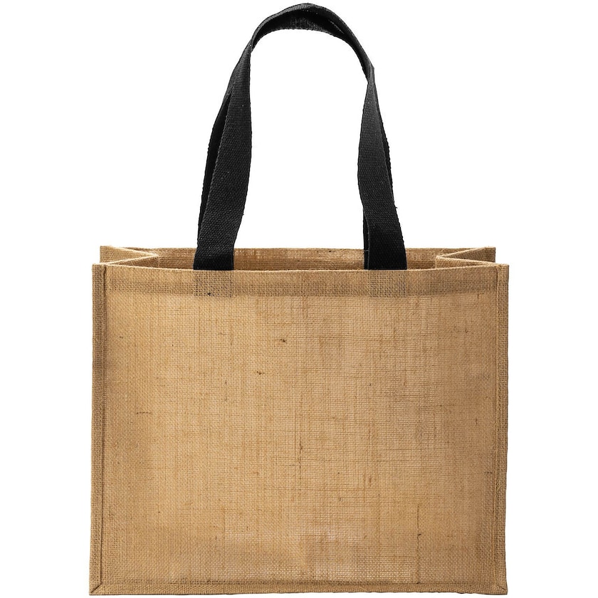 Jutetasche mit langen, farbigen Griffen. Die Tasche hat einen breiten Boden, wodurch sie besonders geräumig ist.