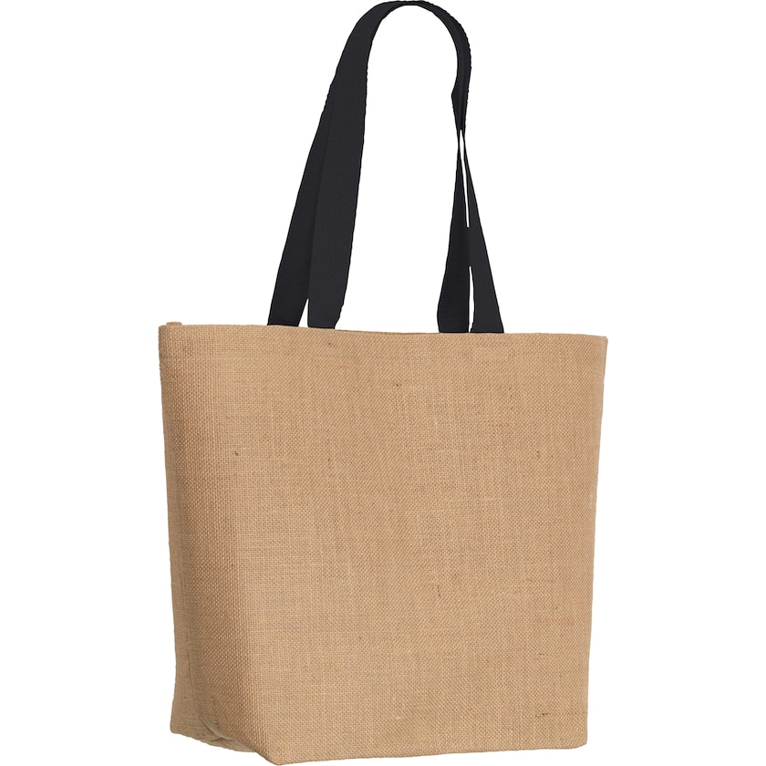 Großer und langlebiger Jutebeutel mit Baumwollgriff Die Innenseite des Jutebeutels ist für erhöhte Festigkeit laminiert. Da der Stoff relativ grob ist, ist es nicht möglich, Motive mit kleinen Details zu drucken.