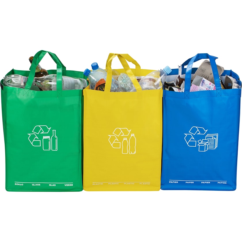 Set mit drei Taschen zur Mülltrennung. Die Taschen sind aus zuverlässigem PP-Material und die drei Taschen werden mit Klettband zusammengehalten. Der Druckpreis ist für den Druck auf einer Tasche.
