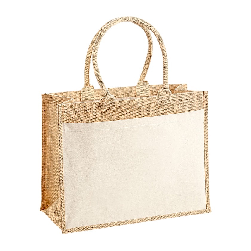 Räumige Jutetasche mit frontaler Aufbewahrungstasche. Der Jutestoff ist laminiert, was der Tasche erhöhte Festigkeit verleiht. Griffe und Aufbewahrungstasche sind aus naturfarbener Baumwolle gefertigt. Die Griffe haben eine Länge von 55 cm. Eine perfekte Wahl für diejenigen, die nach einer geräumiger Jutetasche mit Logo suchen!