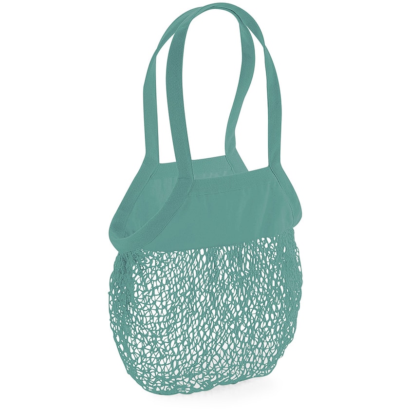 Einkaufsnetz aus 100 % Bio-Baumwolle. Trägt bis zu 6 kg. Die Tasche kann man in der Hand und über die Schulter tragen.