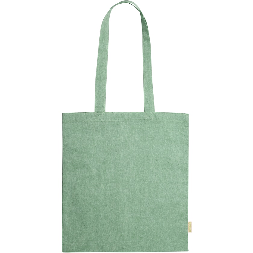 Der Baumwollbeutel ist aus 100 % recycelter Baumwolle. Die Tasche hat einen langen Tragegriff und kann über die Schulter getragen werden. Auf der einen Seite befindet sich ein Etikett, das darauf hinweist, dass der Beute aus umweltfreundlicher Baumwolle hergestellt wurde.