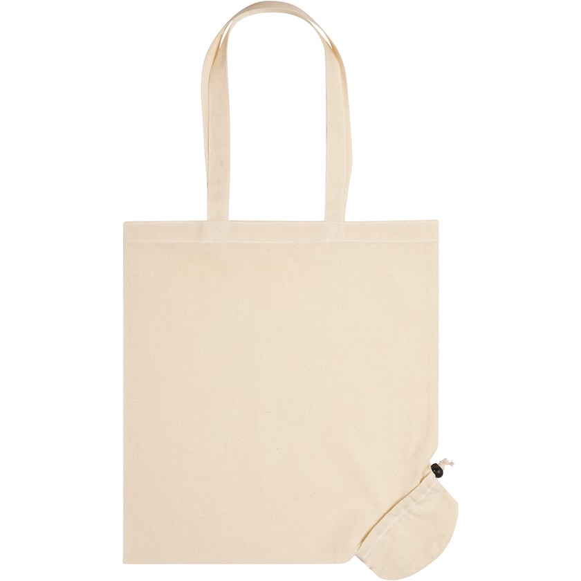 Umweltfreundliche Baumwolltasche aus Bio-Baumwolle. Wenn die Tasche nicht benötigt wird, kann sie zu einer Kugel zusammengerollt werden.
