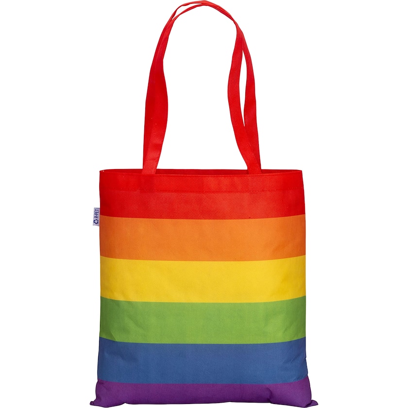 Regenbogenfarbene Vliestasche aus umweltfreundlichem rPET. Die Box hat lange Griffe. Es ist nur ein 1-farbiger Druck möglich.