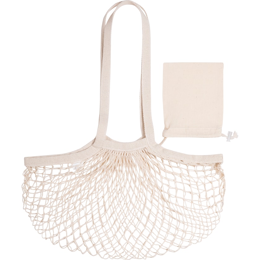 Netzbeutel aus naturbelassener Baumwolle. Wird das Netz nicht gebraucht, lässt es sich zusammenfalten und kann in der dazugehörigen Aufbewahrungstasche verstaut werden. Gedruckt wird auf die Aufbewahrungstasche.