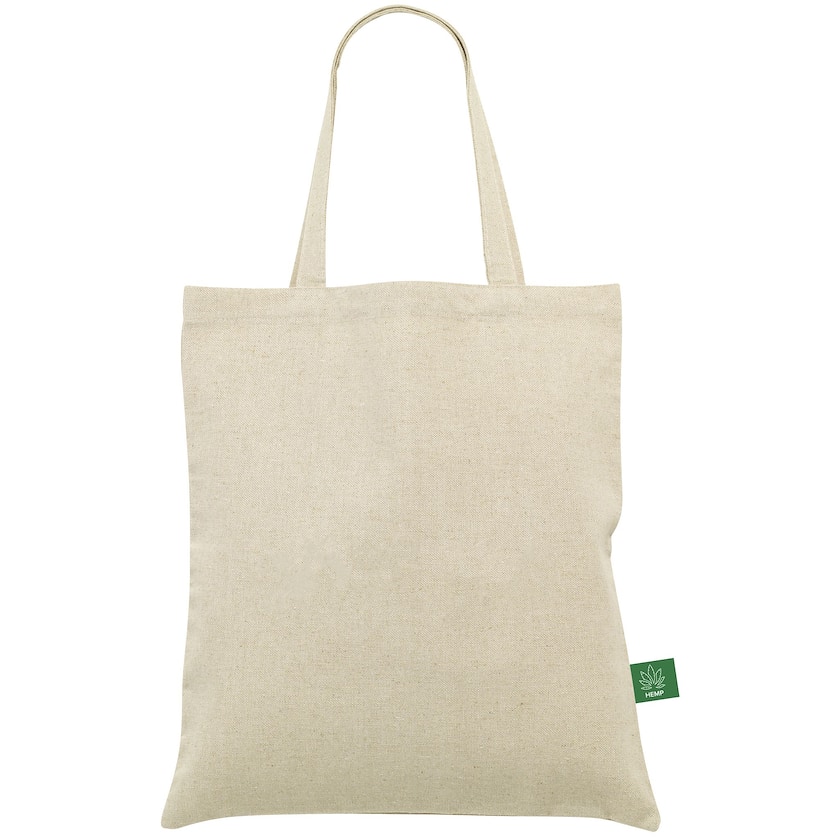 Stoffbeutel aus strapazierfähigem Hanf. Die Stofftasche hat lange Henkel und seitlich befindet sich ein Etikett, das darauf hinweist, dass die Tasche aus Hanf gefertigt ist. Hanf ist sowohl ein langlebiges Material als auch eine gute Wahl für die Umwelt. Die Hanfpflanze verbraucht beispielsweise bis zu 35% weniger Wasser als die Baumwollpflanze. Darüber hinaus reinigen die Hanfwurzeln den Boden von giftigen Stoffen.