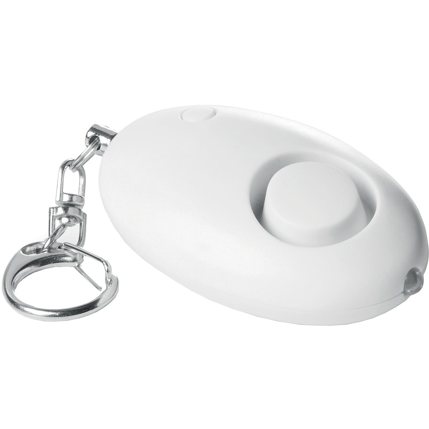 Personal-Alarm mit Schlüsselanhänger. Der Alarm wird aktiviert, indem man den Schlüsselring herauszieht. Das Gerät hat zudem ein weißes LED-Licht.