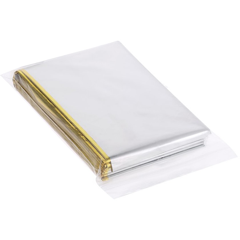 Rettungsdecke im praktischen Taschenformat. Reflektiert die Körperwärme und hilft dabei, sich schnell aufzuwärmen und die Wärme länger zu speichern. Das Bedrucken erfolgt über einen Aufkleber auf der Verpackung, der individuell gestaltet werden kann.