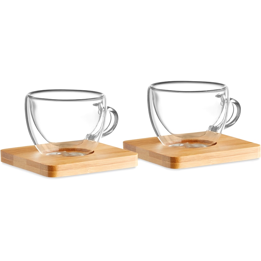 Set aus zwei Espressogläsern mit Bambusuntersetzern. Die Gläser fassen jeweils 9 cl. Geliefert in einer schönen Presentbox. Gedruckt werden kann entweder auf den Verpackungsbanner oder auf einen der Untersetzer.