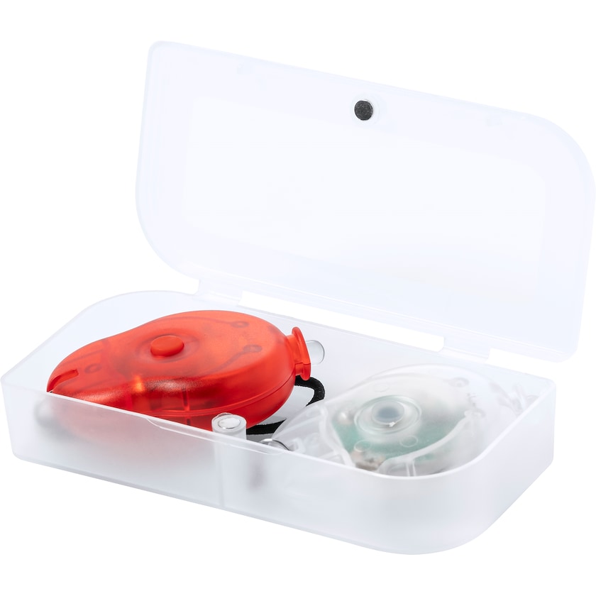 Set mit Vorder- und Rücklicht für das Fahrrad. Die Lampen haben zwei Leuchtmodi. Der Druck erfolgt auf der Kunststoffbox.