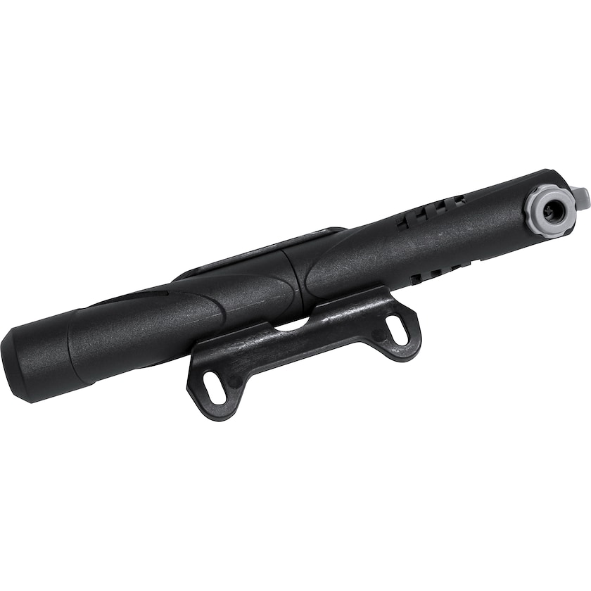 Kompakte Fahrradpumpe. Die Fahrradpumpe wird mit einer Halterung geliefert, mit der sie am Fahrradrahmen befestigt werden kann. Der Druck kann maximal zweifarbig erfolgen.