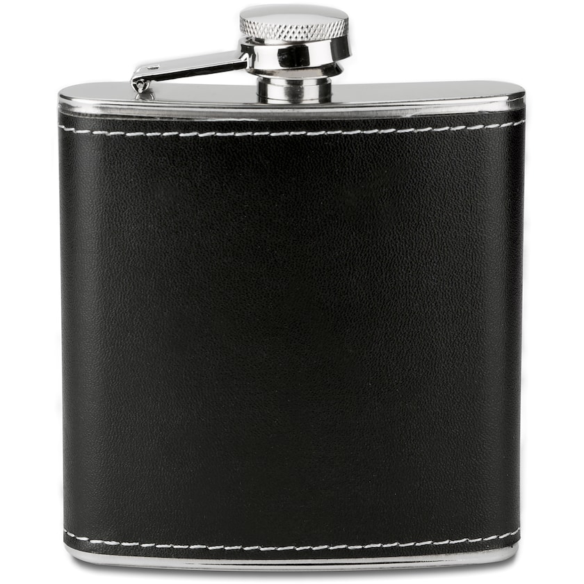 Eleganter Flachmann aus Metall und Kunstleder, fasst 18 cl. Markierung erfolgt mit Lasergravur auf der Kunstlederfläche.