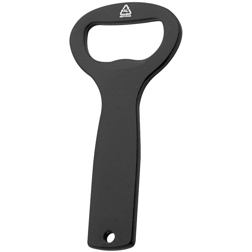 Flaschenöffner aus recyceltem Alumnium. Auf der Oberseite des Flaschenöffners ist ein Symbol angebracht, das zeigt, dass er aus recyceltem Aluminium hergestellt ist. Erhältlich in verschiedenen Farben.