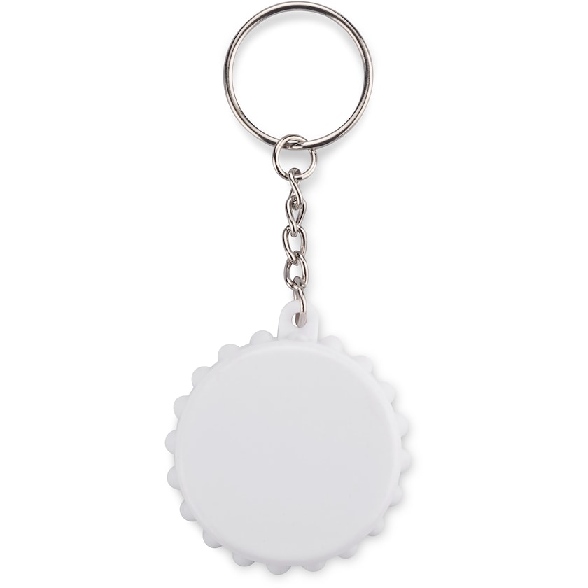 Flaschenöffner, der an einem Schlüsselring befestigt ist. Myles hat eine lustige Form, die an einen Flaschenverschluss erinnert.