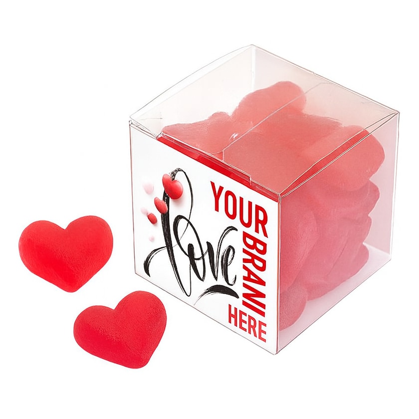 Eine große Packung köstlicher Geleeherzen. Die transparente Verpackung ist auf zwei gegenüberliegenden Seiten mit 4-farbig bedruckten Etiketten versehen.